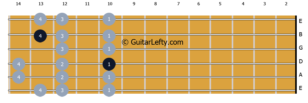 The notes of the scale are displayed on the fretboard by the light grey circles, with the darker blue circles highlighting the root notes. The root notes are always C tones. The numbers on each circle indicate which finger should play the note. The patterns are as follows