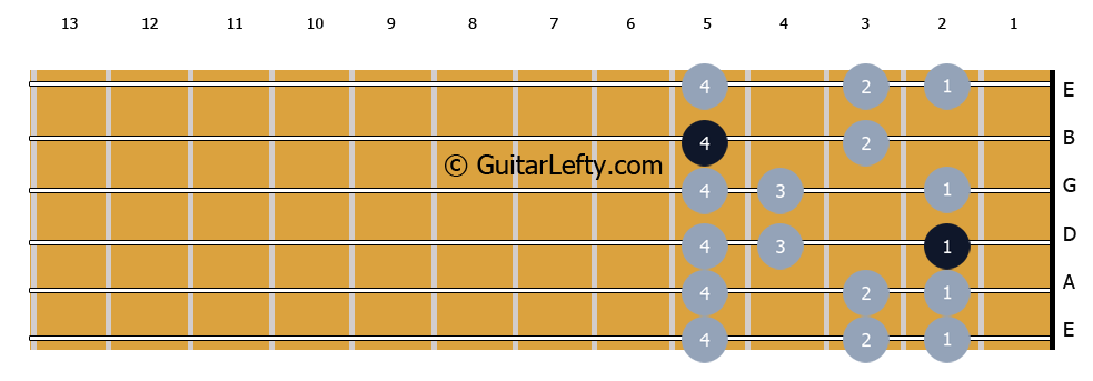 The notes of the scale are displayed on the fretboard by the light grey circles, with the darker blue circles highlighting the root notes. The root notes are always E tones. The numbers on each circle indicate which finger should play the note. The patterns are as follows