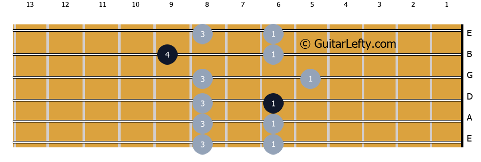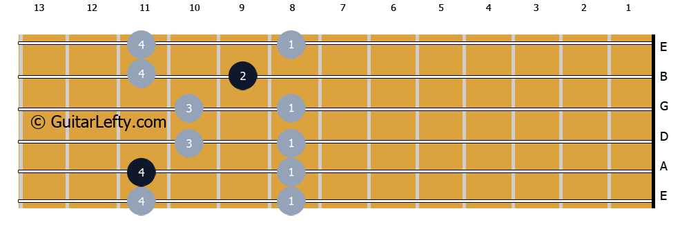 The notes of the scale are displayed on the fretboard by the light grey circles, with the darker blue circles highlighting the root notes. The root notes are always A Flat tones. The numbers on each circle indicate which finger should play the note. The patterns are as follows